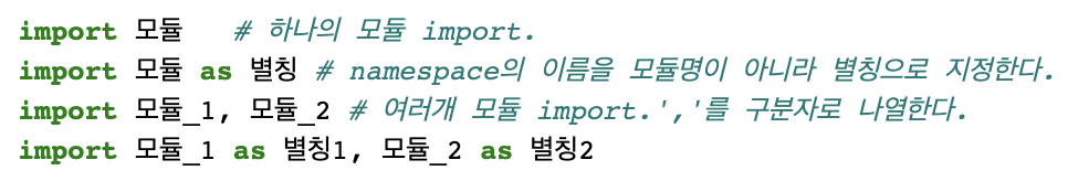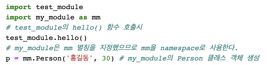 - 모듈을 import 하고 그 안에 함수, 클래스들을 사용할 때는 모듈명이 namespace 역할을 하기 때문에 모듈명.함수( ), 모듈명.Class 구문으로 호출한다.