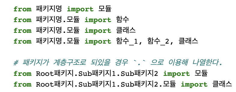 - [from 사용할 것의 경로] import 사용할 것 [as 별칭] [, 사용할 것..]