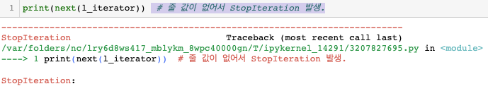 - 모든 원소들이 다 제공해 StopIteration Exception이 발생하면 반복문을 멈추고 빠져나온다.