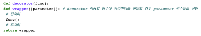 def wrapper(): # 관례적으로 inner 함수는 wrapper라고 표현한다.