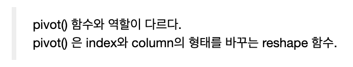 - 엑셀의 pivot table 기능을 제공하는 메소드.분류별 집계(Group으로 묶어 집계)를 처리하는 함수로 group으로 묶고자 하는 컬럼들을 행과 열로 위치시키고 집계값을 값으로 보여준다.역할은 groupby()를 이용한 집계와 같은데 여러개 컬럼을 기준으로 groupby 를 할 경우 집계결과를 읽는 것이 더 편하다.(가독성이 좋다)