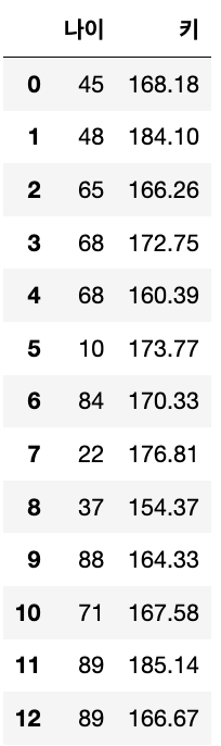 age = np.random.randint(1, 100, size= 12) # 1 ~ 99 사이의 난수 30개