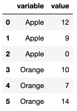 value_vars=['Apple','Orange', 'Banana'], # 단일 컬럼의 값으로 변경할 컬럼이름들을 지정.