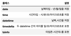 - 파이썬은 datetime 모듈을 이용해 일시를 처리한다. datetime 모듈은 날짜/시간 관련 타입으로 date, time, datetime 세개의 클래스를 제공한다.