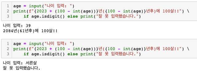 🍠 그렇다고 100 - int(age) 를 변수 설정을 하면, 서른살 입력 시 type Error 발생.