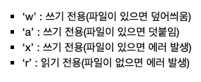 - 파일 모드는 파일을 어떤 목적으로 open 할지 정한다.