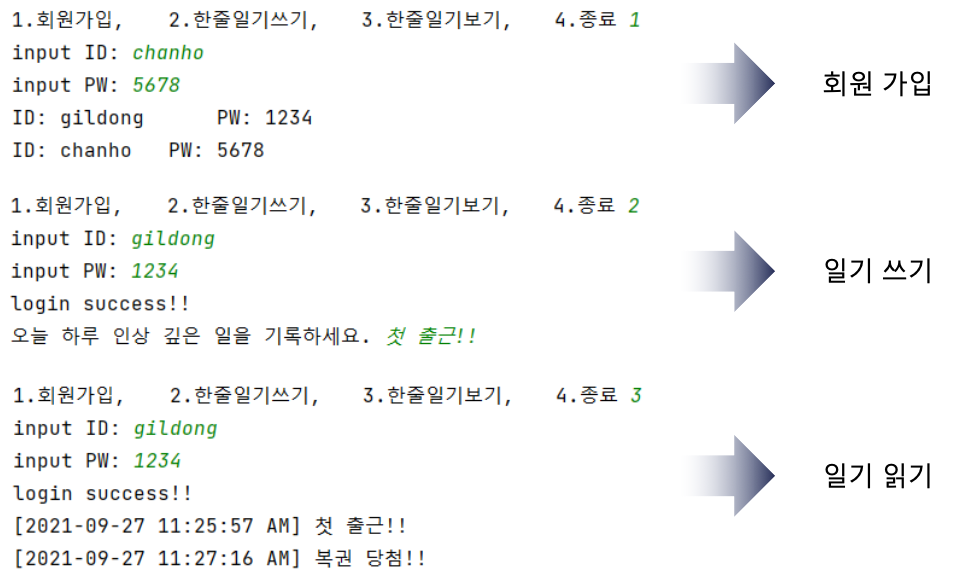 - 회원 계정별 텍스트 파일을 생성한 후 회원 본인 파일에 ‘한 줄 일기’를 쓰고 읽는 프로그램을 만들어보자.