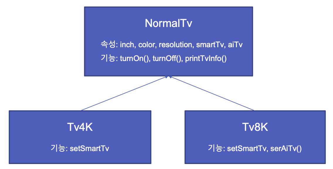 - TV클래스를 다음과 같은 상속 구조로 만들고 객체를 생성해 보자.
