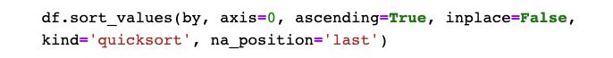 - na_position: 기본값은 'last'입니다. 결측값(NaN)의 위치를 선택합니다. 'last'는 결측값을 맨 마지막에 두고, 'first'는 결측값을 맨 앞에 둡니다.