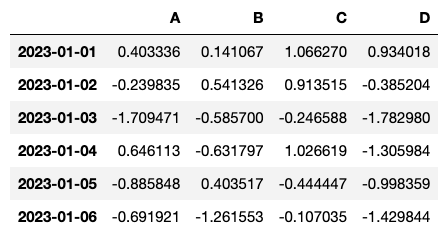 df = pd.DataFrame(np.random.randn(6, 4), index = dates, columns = ["A", "B", "C", "D"])