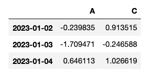 df.loc["2023-01-02":"2023-01-04", ["A","C"]]