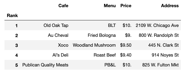 df = df.loc[:,["Rank", "Cafe", "Menu", "Price", "Address"]]