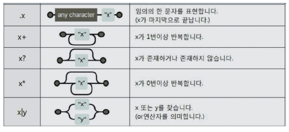 - \. : 리터럴 점(.) 문자와 일치합니다. .는 어떤 문자와도 일치하는 메타문자이므로, 리터럴 점 문자와 일치시키려면 탈출 문자 \를 앞에 두어야 합니다.