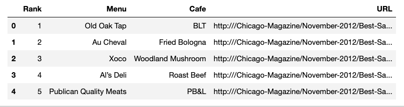 df = pd.DataFrame(data, columns = ["Rank", "Cafe", "Menu", "URL"])